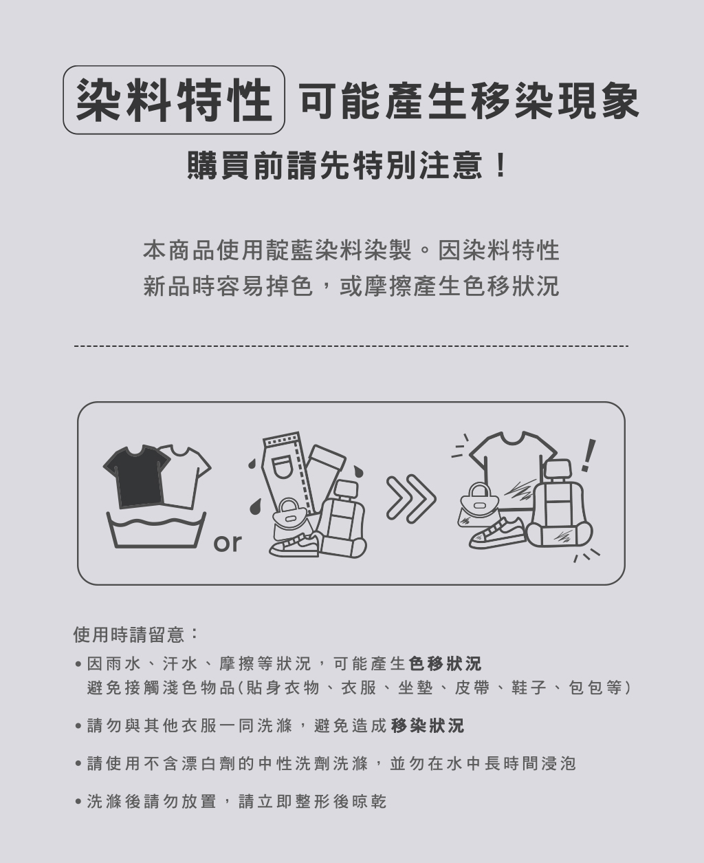 1.由於牛仔商品具有特殊的染料特性,因此會產生洗滌後逐漸褪色的獨特風格,摩擦時亦會略為掉色。