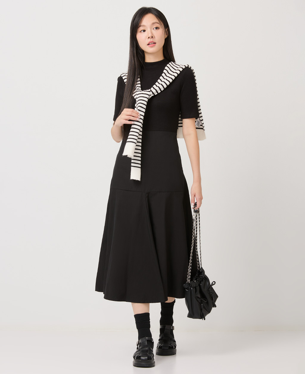 拼接磨毛中腰立領洋裝