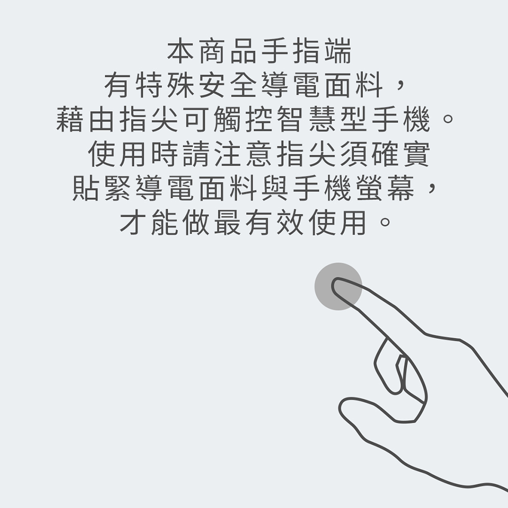 ●注意事項 本商品手指端有特殊安全導電面料,藉由指尖可觸控智慧型手機。使用時請注意指尖需確實貼緊導電紗與手機螢幕,才能做最有效使用。