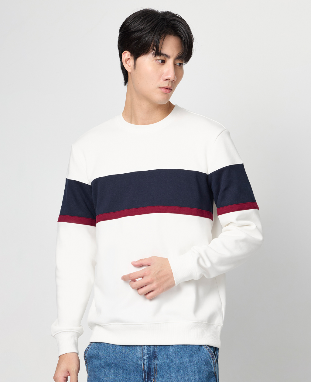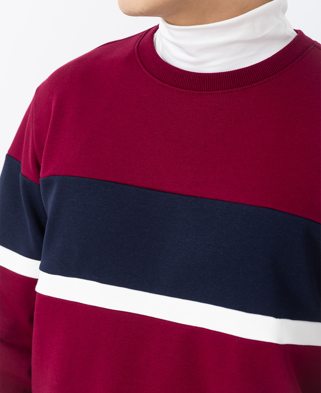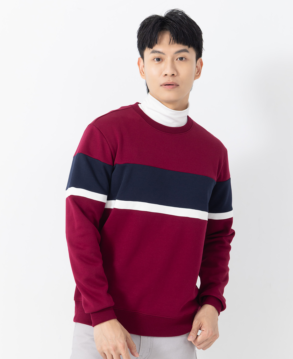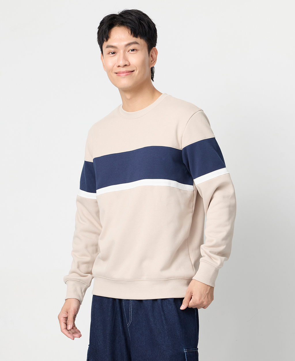 拼接條紋刷毛圓領大學T