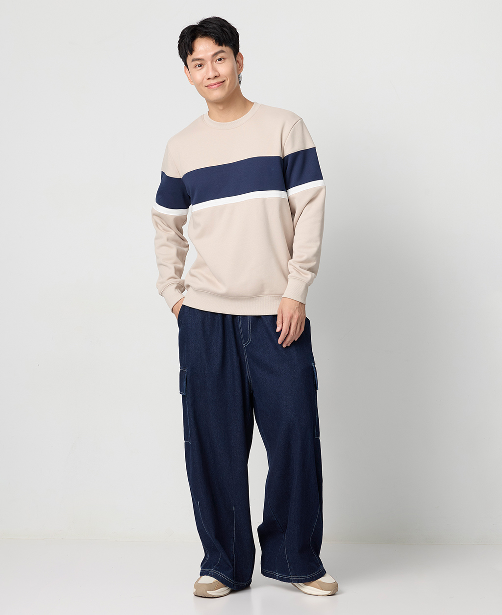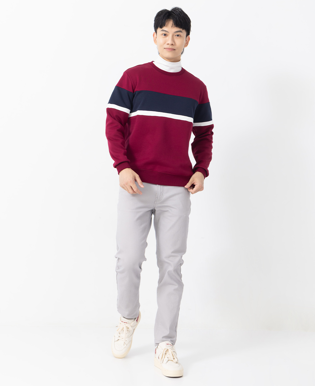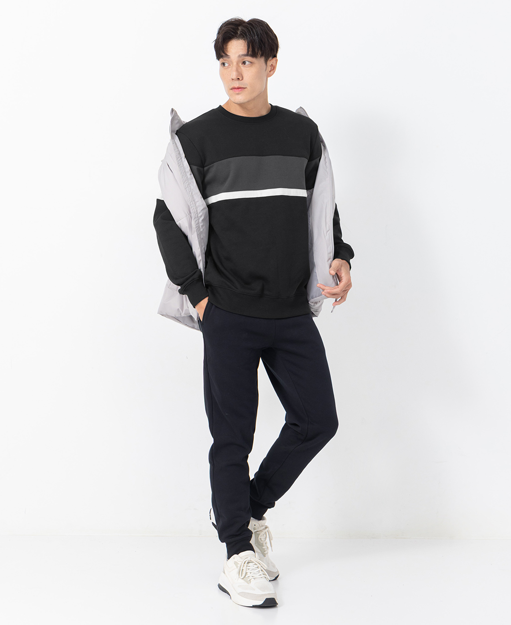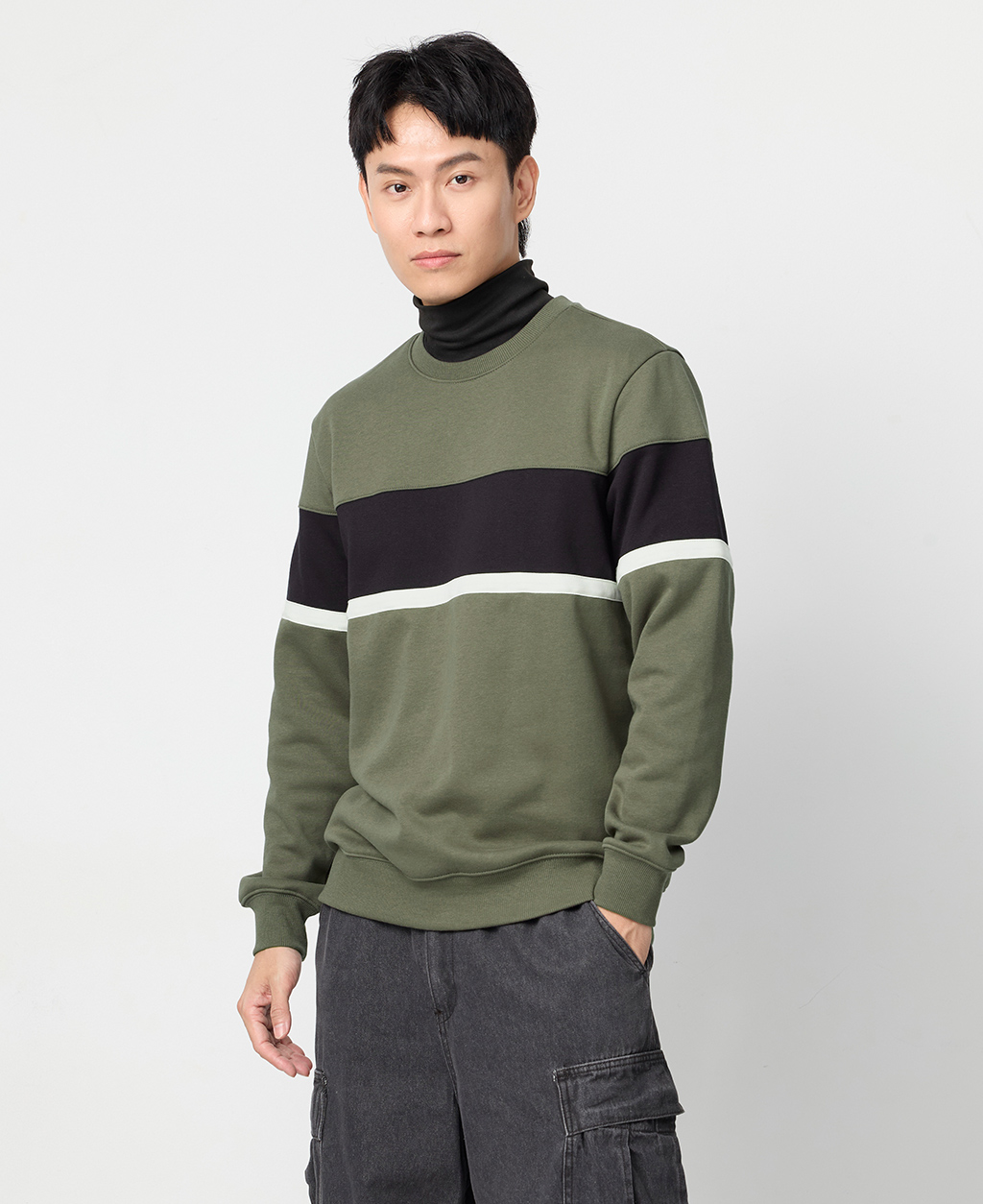 拼接條紋刷毛圓領大學T