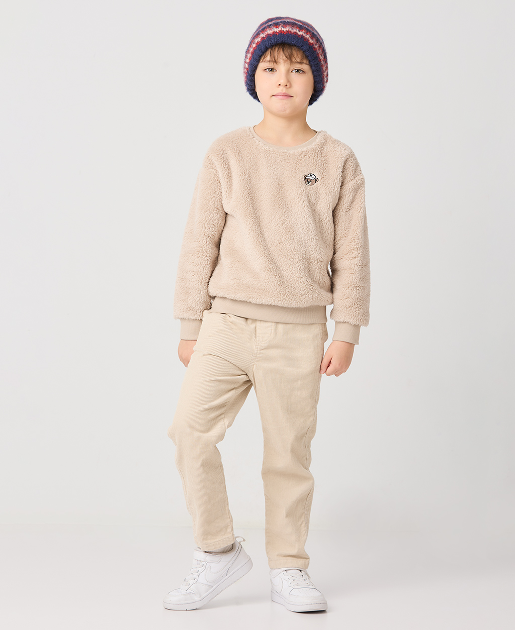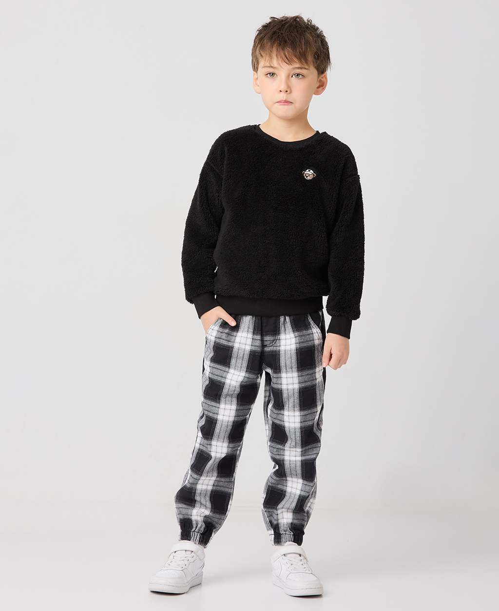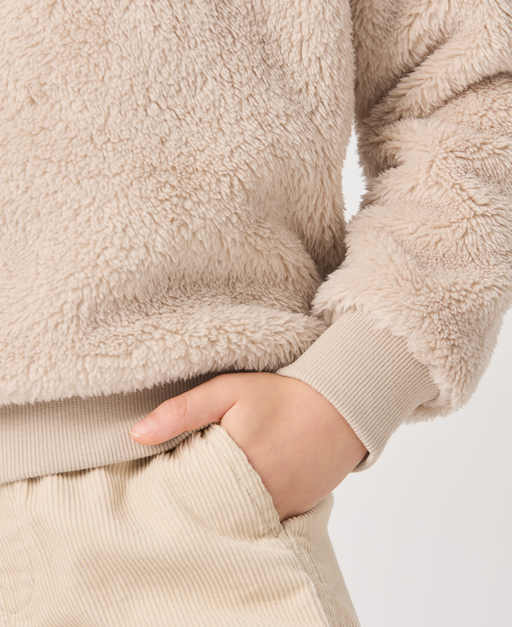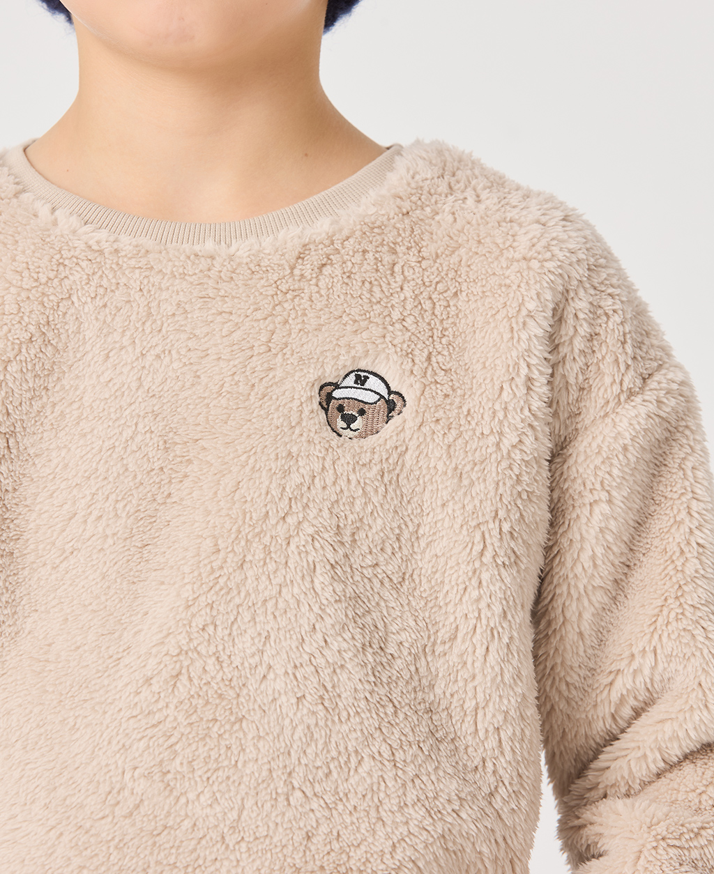 童絨毛左胸繡落肩圓領上衣