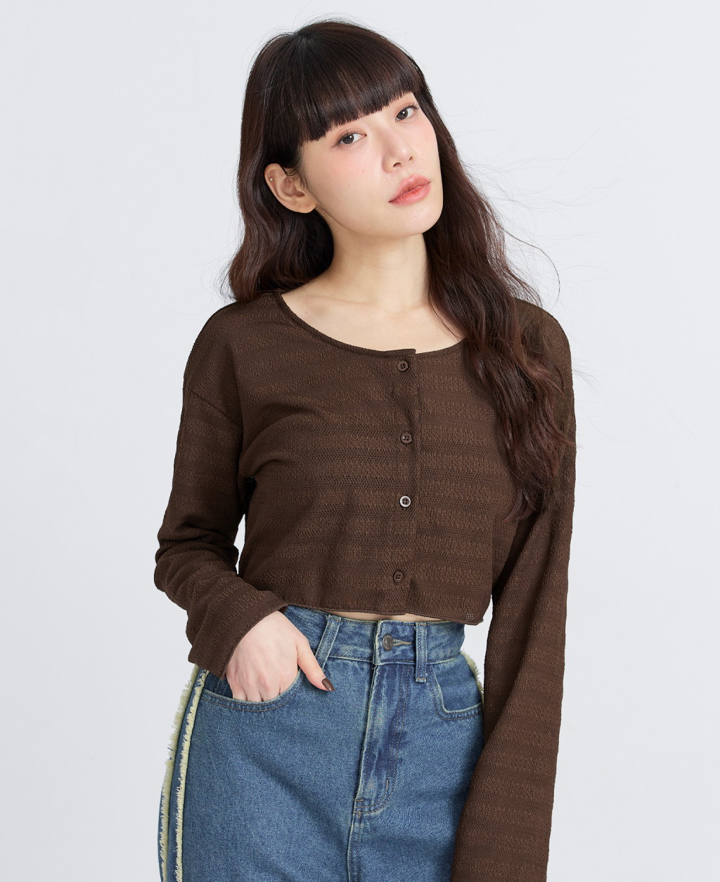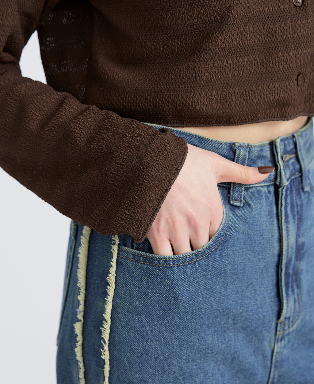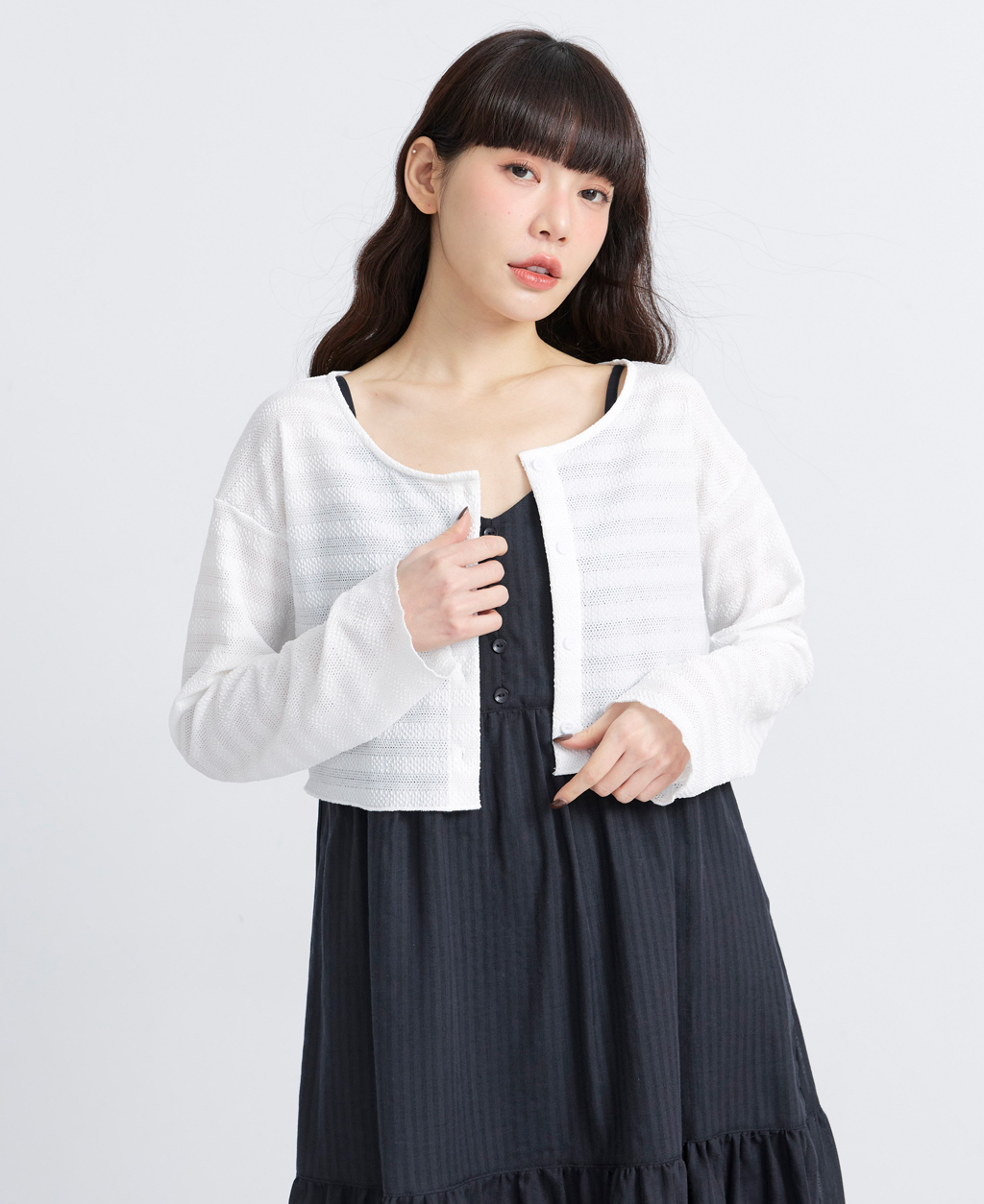 ●注意事項 1.此布料因編織特性,如被指甲或突起物、飾物及包包上的金屬裝飾等勾拉,可能會產生抽紗破洞的現象,穿著和保管時請注意。 2.建議放入洗衣袋中洗滌。