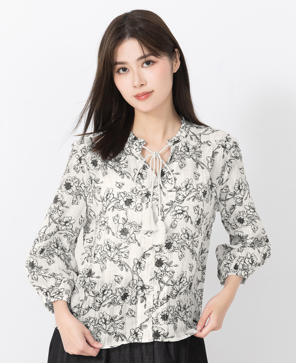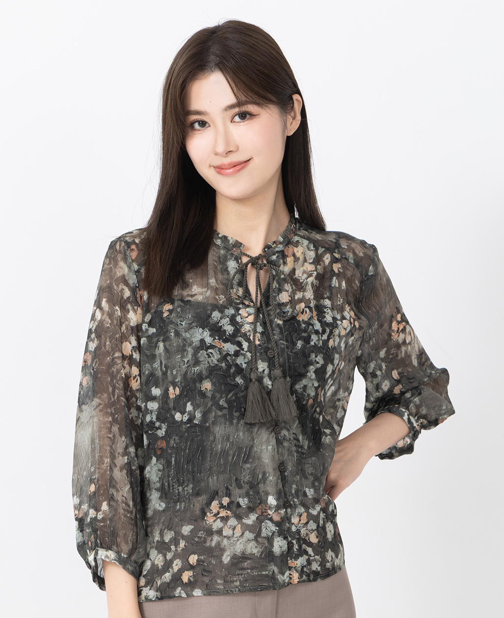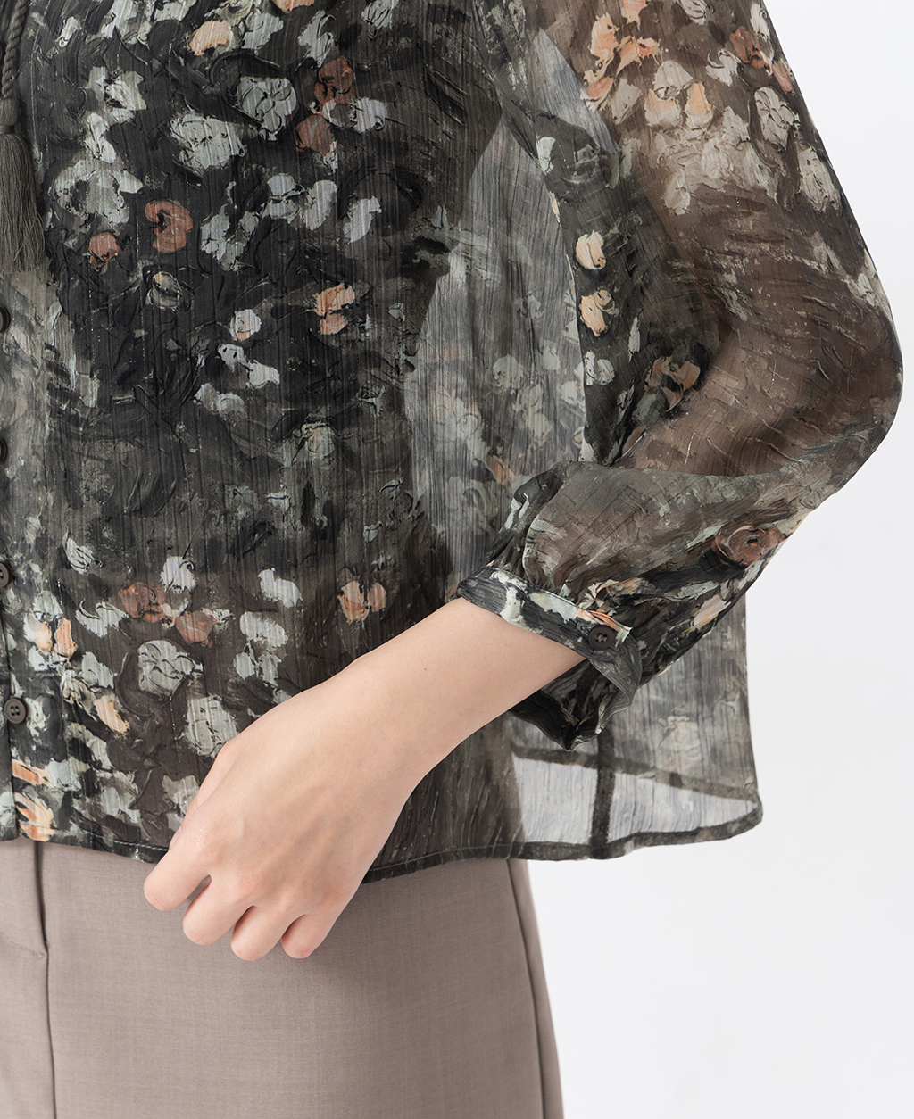 ●注意事項 1.此布料因編織特性,如被指甲或突起物、飾物及包包上的金屬裝飾等勾拉,可能會產生抽紗破洞的現象,穿著和保管時請注意。 2.建議放入洗衣袋中洗滌。