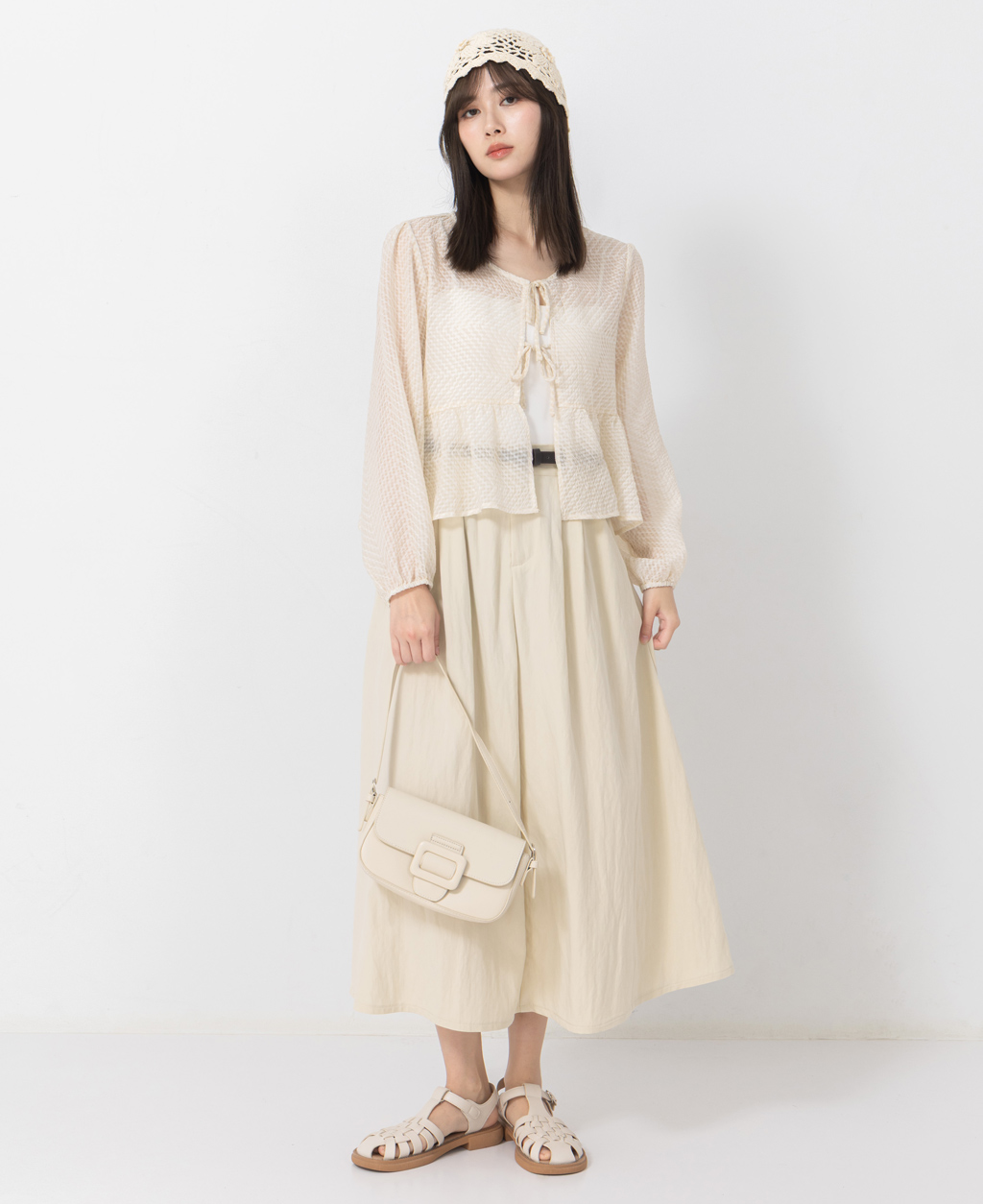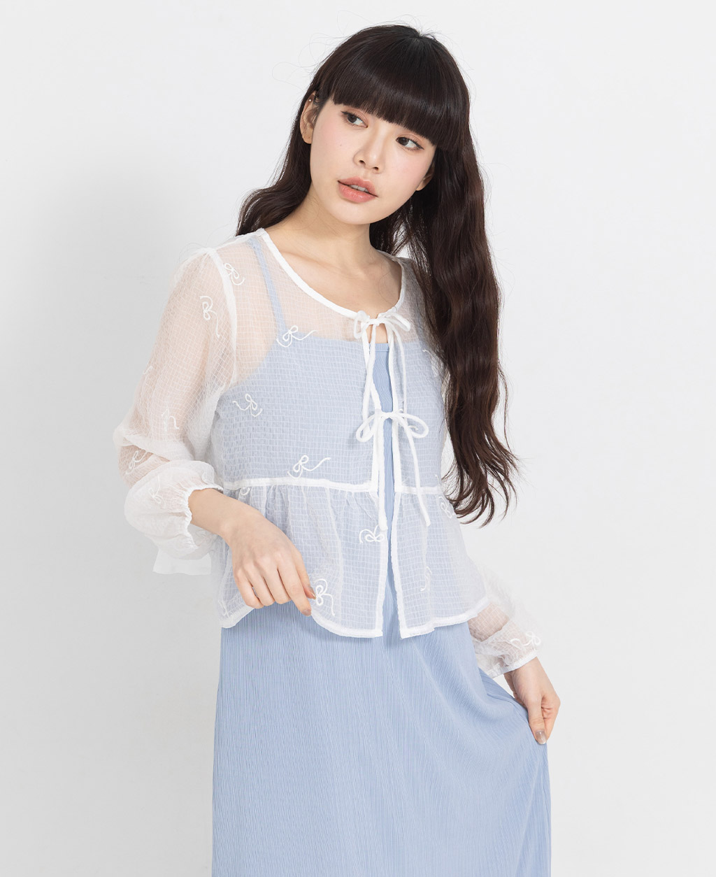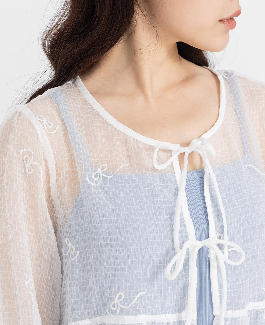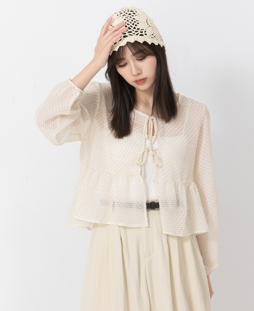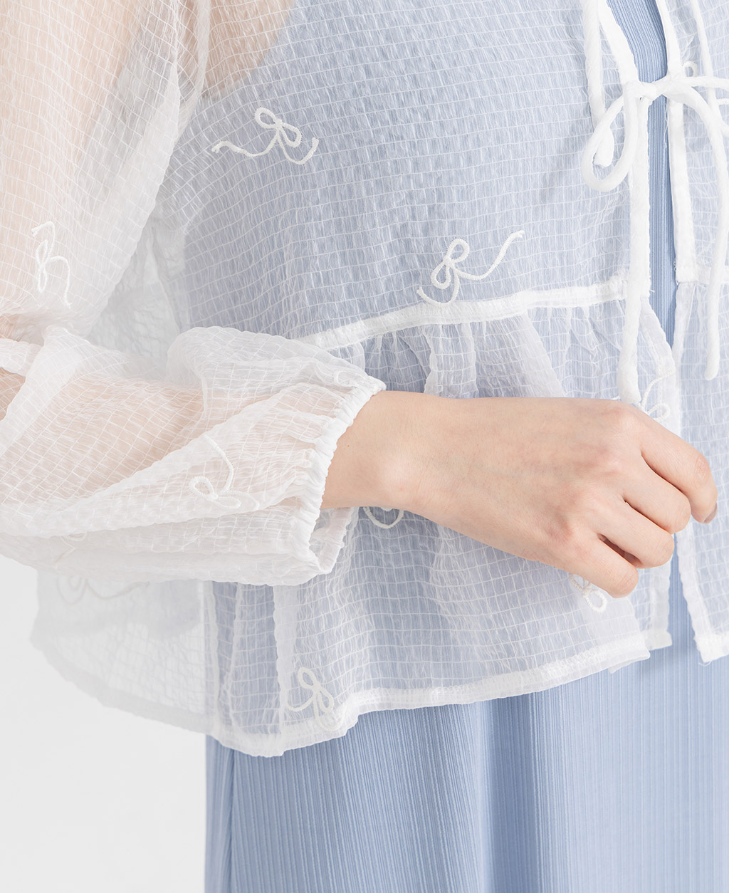●注意事項 1.此布料因編織特性,如被指甲或突起物、飾物及包包上的金屬裝飾等勾拉,可能會產生抽紗破洞的現象,穿著和保管時請注意。 2.建議放入洗衣袋中洗滌。