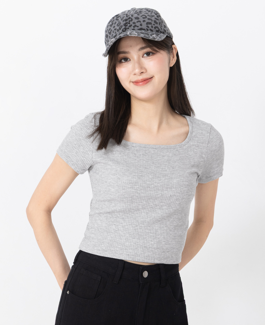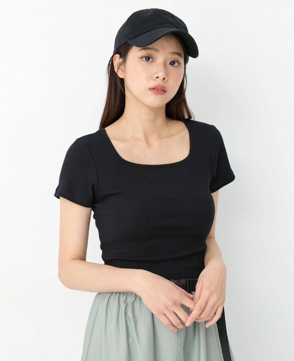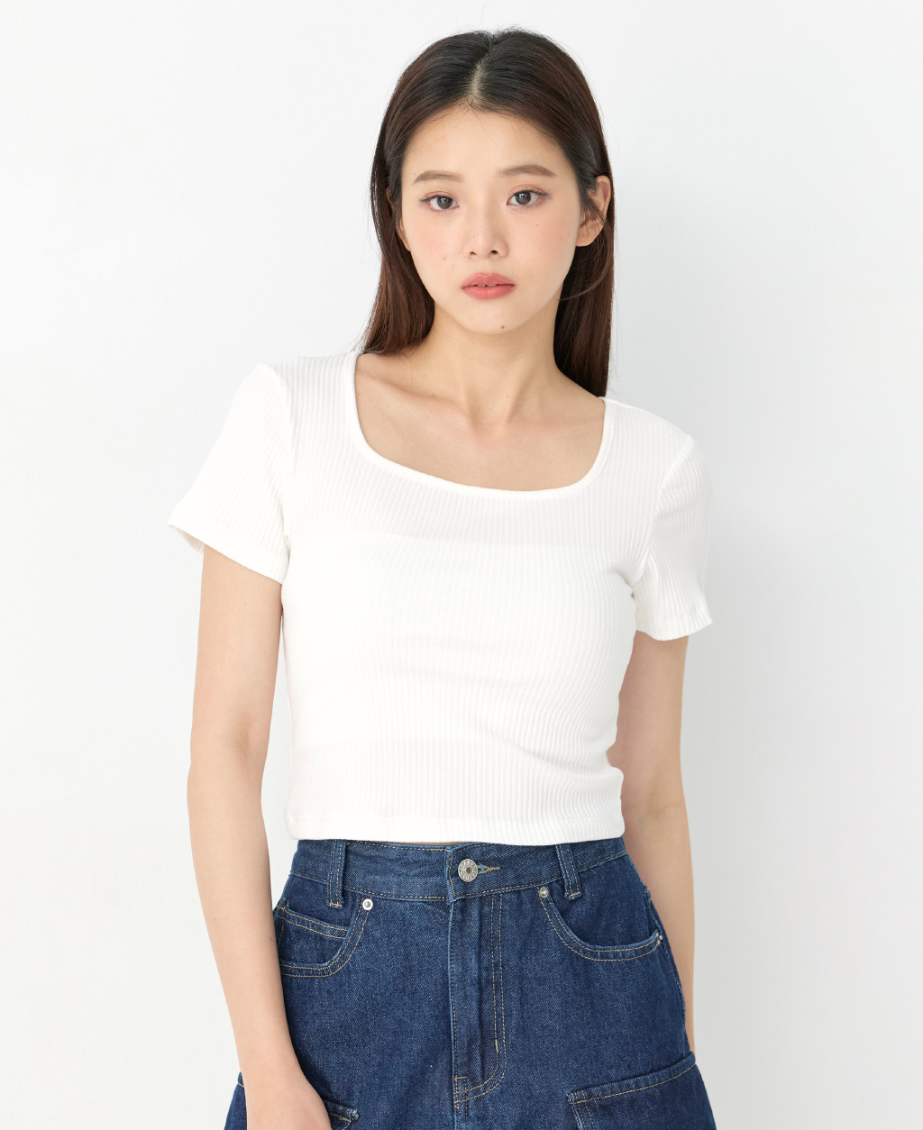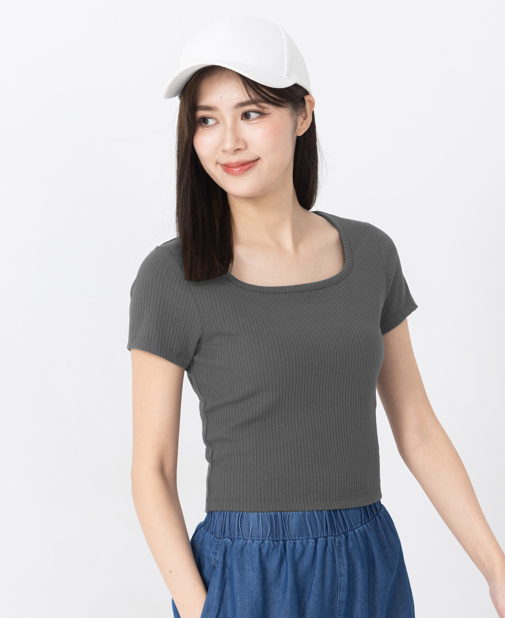 坑條方領合身短版上衣