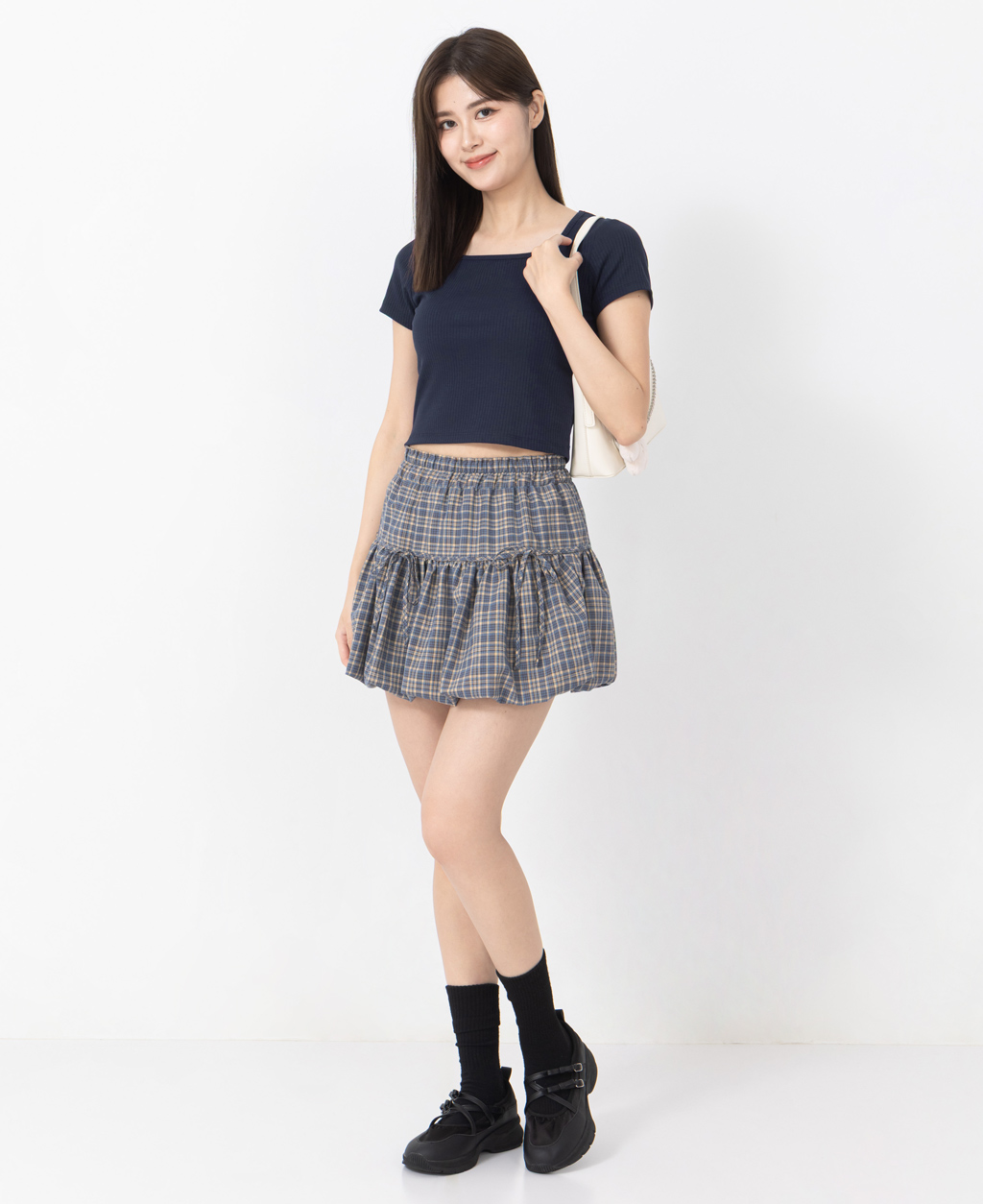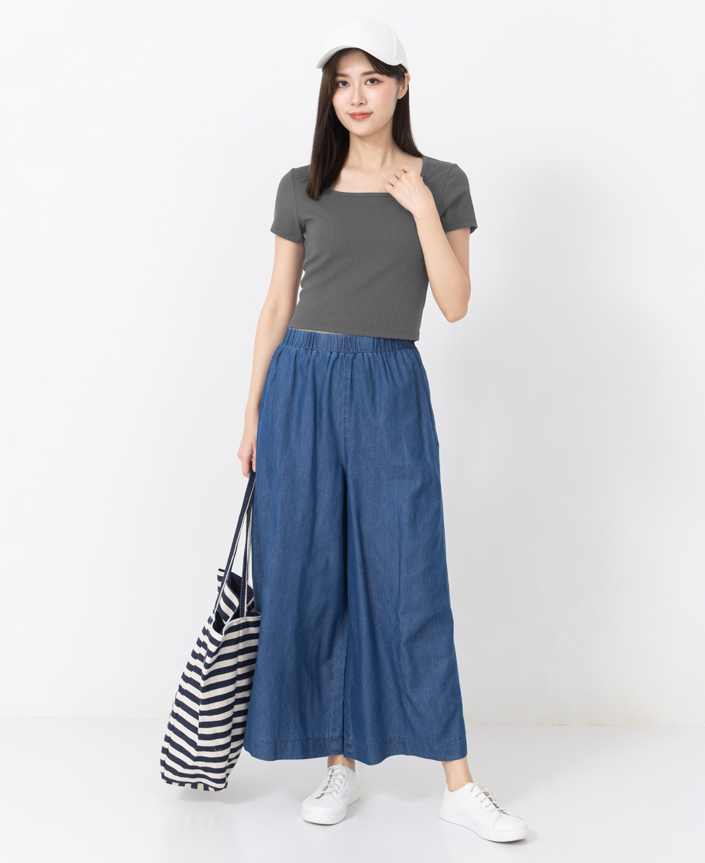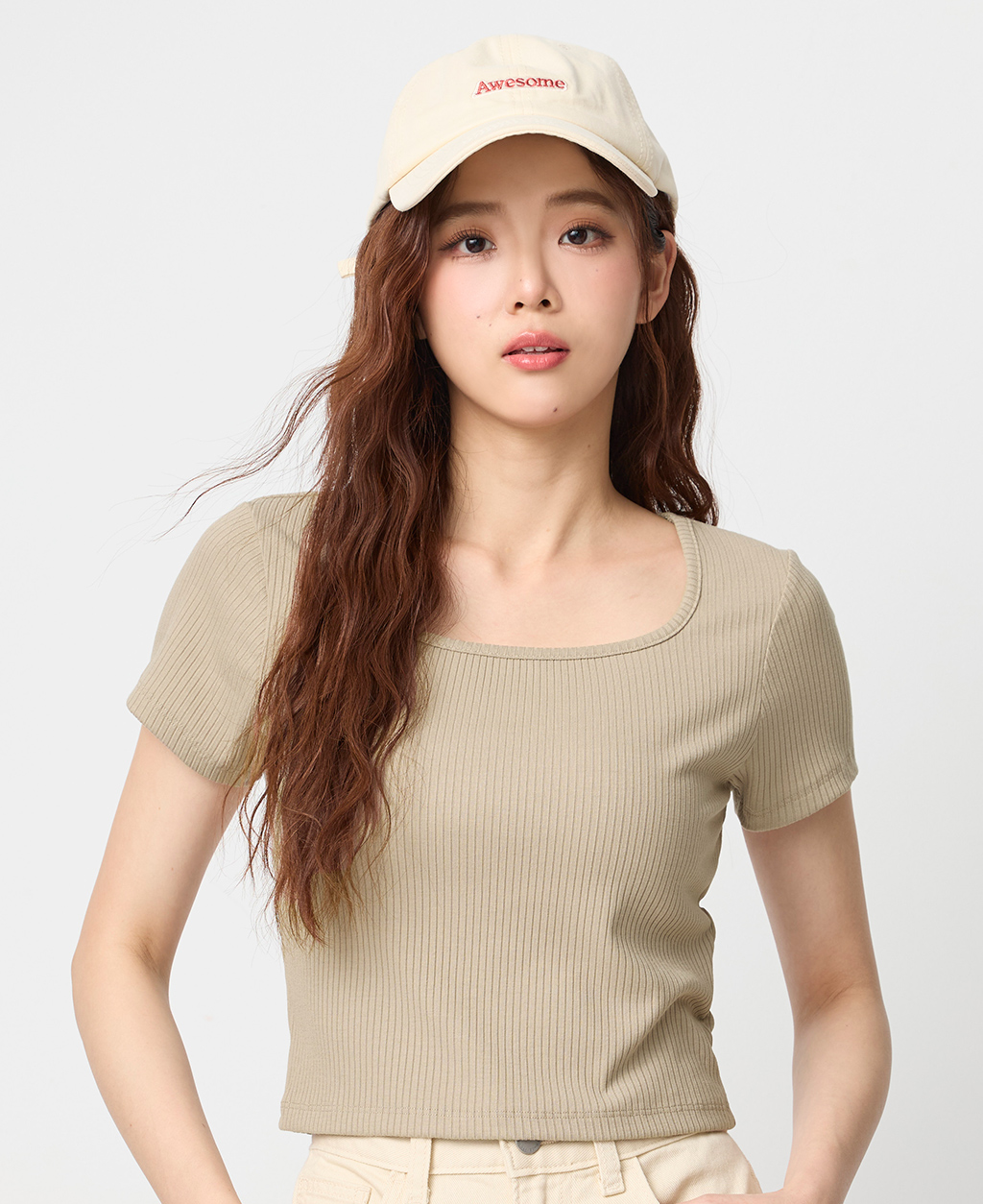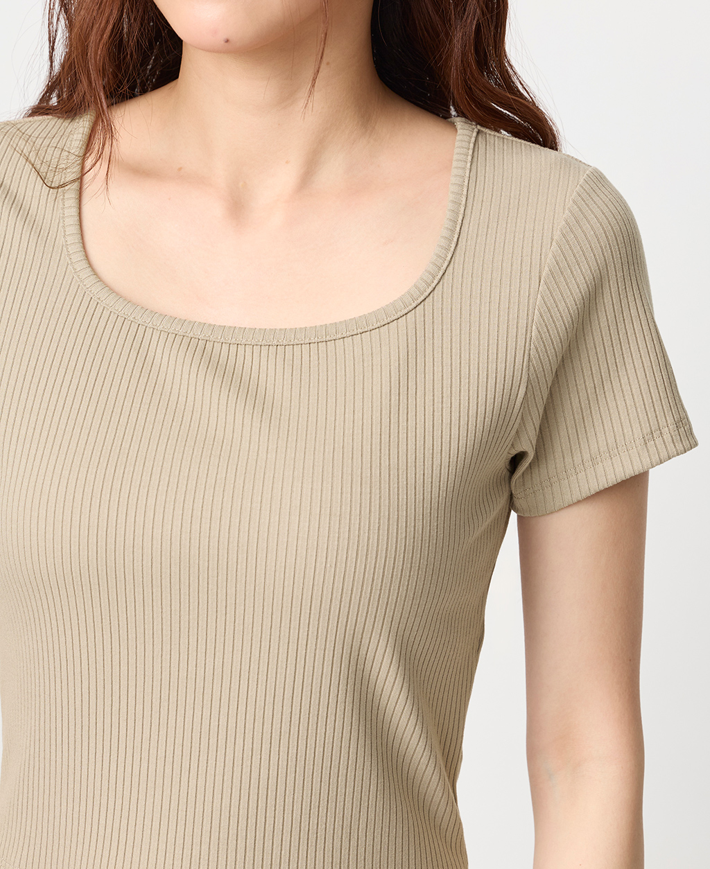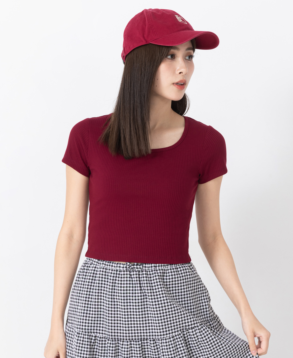 坑條方領合身短版上衣