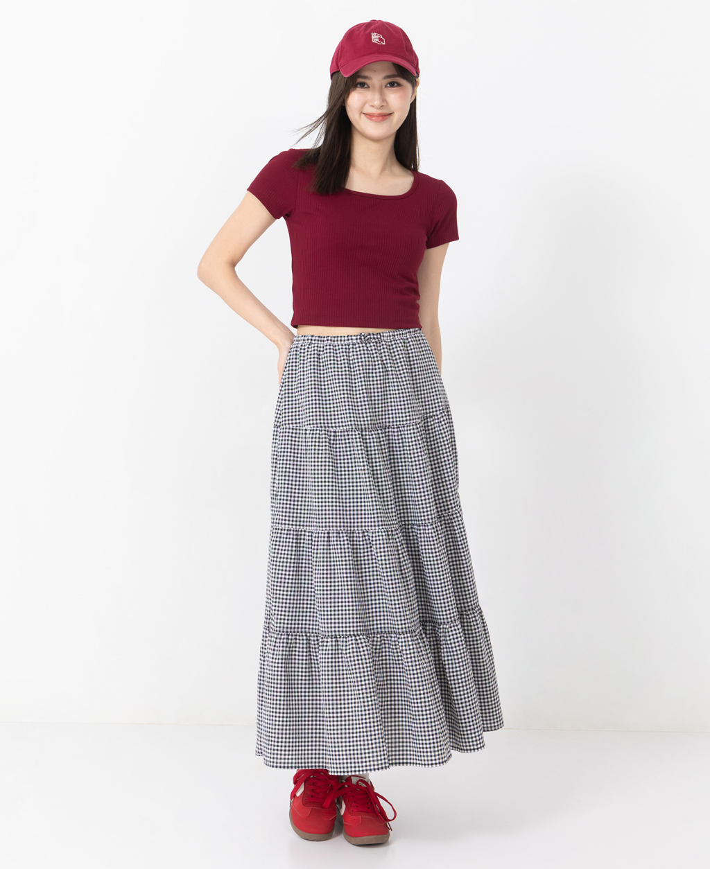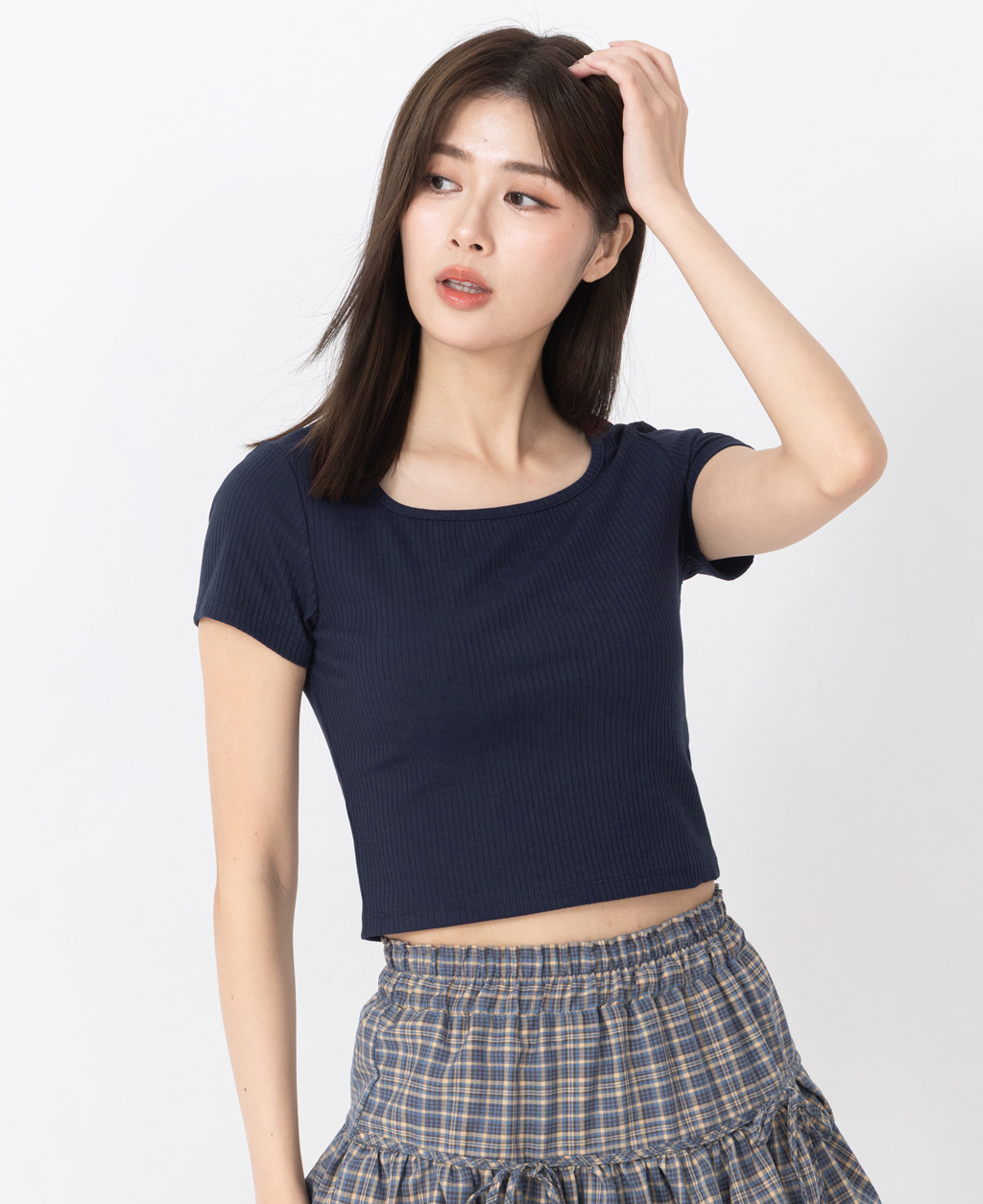 坑條方領合身短版上衣