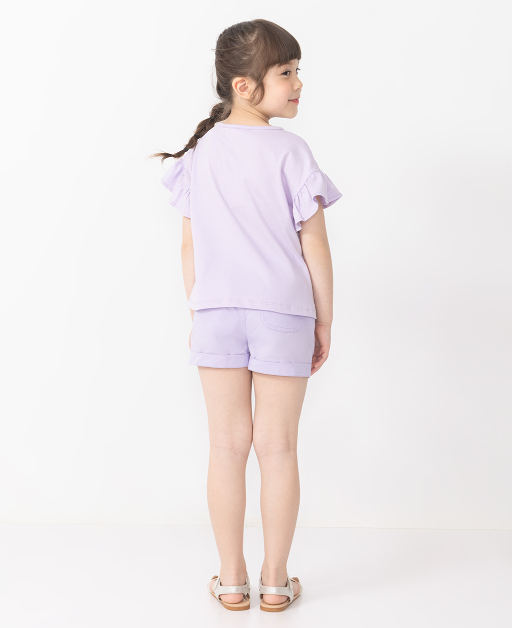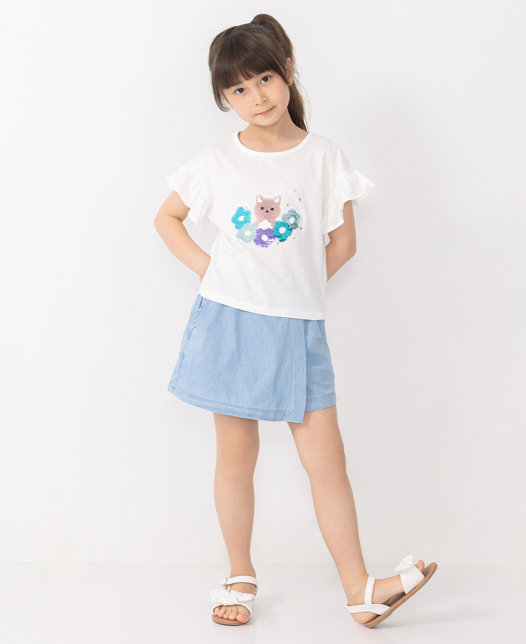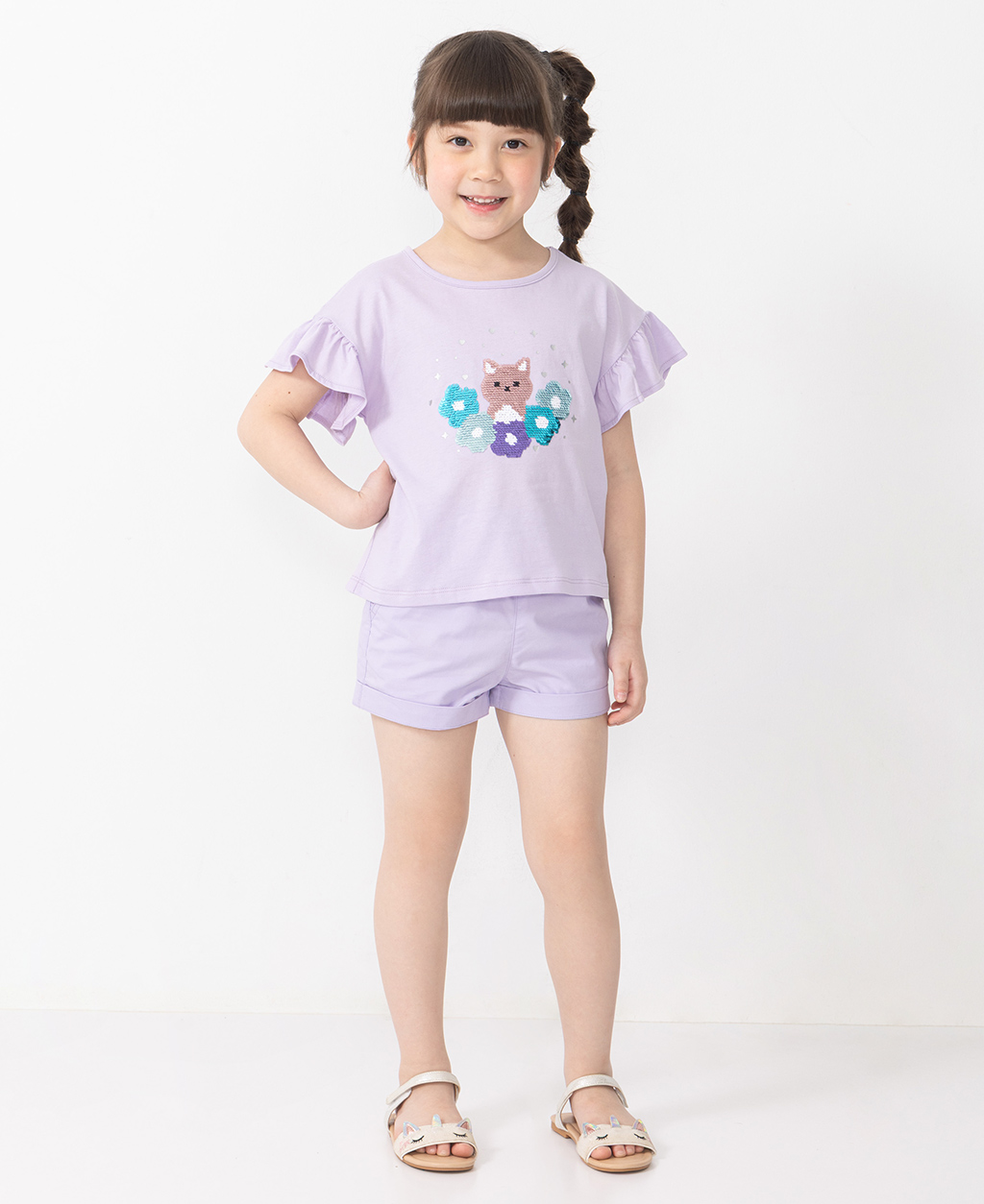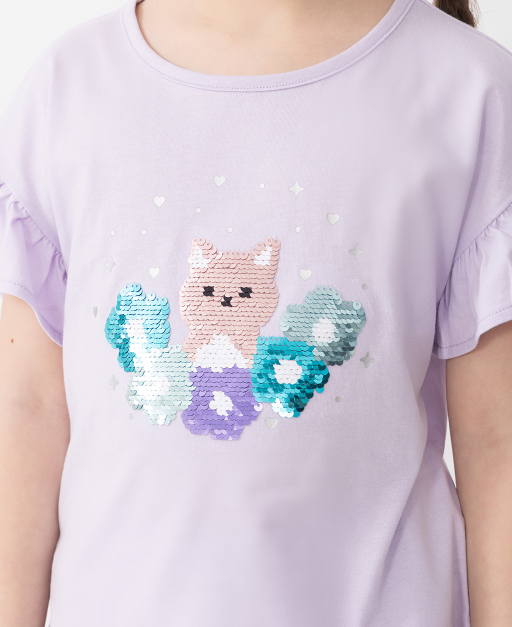 童亮片貓咪落肩荷葉袖圓領短T